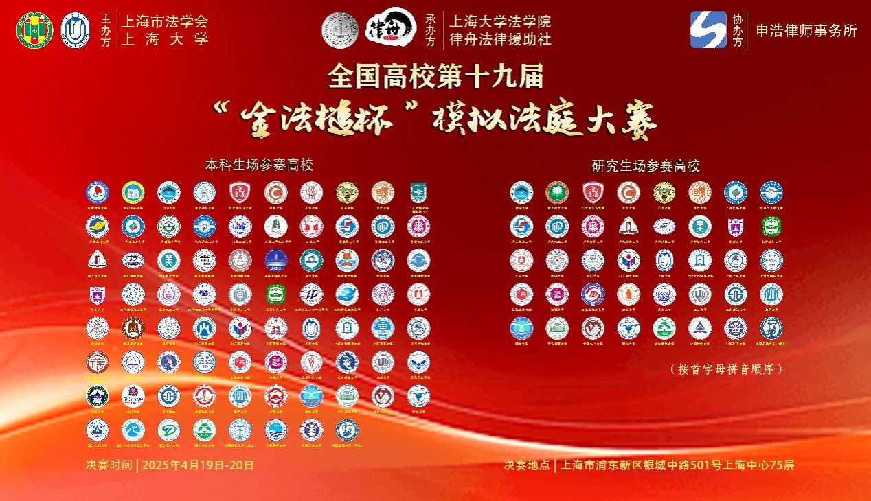全国高校第十九届“金法槌杯”模拟法庭大赛由上海市法学会、上海大学联合主办,上海大学法学院、律舟法律援助社承办,上海申浩律师事务所协办,经过启动仪式、报名、初赛环节,于2025年4月19、20日顺利进行了决赛。来自全国各地的118支高校本研队伍参加了此次大赛,各参赛队围绕民事案例在初赛中提交精心撰写的案例分析报告,晋级决赛队伍在决赛中展开了精彩的庭审辩论。