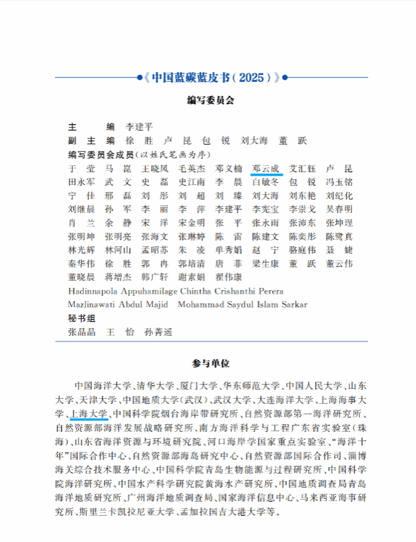 近日,《中国蓝碳蓝皮书2025》正式刊印,上海大学法学院邓云成副研究员参与相关章节编写,也是我校专家首次受邀编写蓝碳蓝皮书。